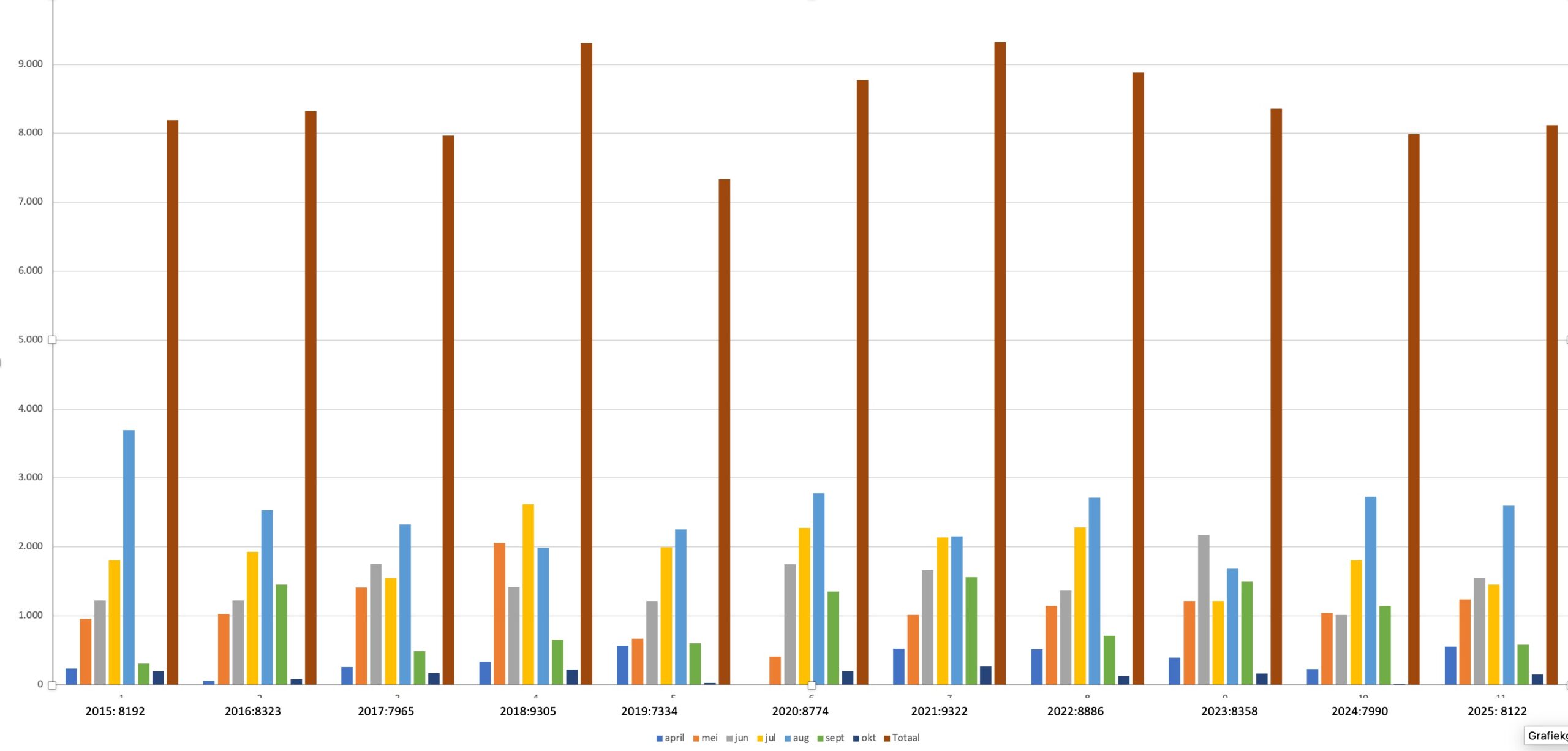 The lock is currently closed for the winter. In 2025, 8,122 vessels passed through the lock. This is roughly the same as last year, despite the high number of vessels passed during Sail2025: 1,542. On the opening day of Sail, August 20, 2025, an all-time record number of vessels passed: 379. During the 2025 sailing season, the lock was closed for only 41 half-days because the pumping station had to discharge water from North Holland. But there were also other reasons this year that the lock could not open. Due to damage to the lock gate, we were closed from August 9 to 13, 2025 (10 half-days). And on July 1 and 2, it was so hot that locking the lock was irresponsible for the lock keepers. All in all, we were open for passage on 83% of the 330 available half-days (in 2024: 66%). The 2025 annual calendar can be found here. Het overzicht van het aantal doorvaarten 2015-2025 is here .